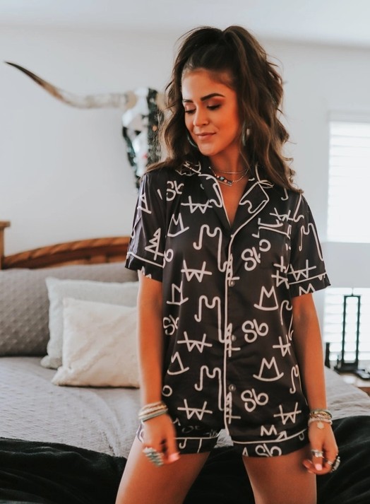 This 2-piece Black Brand pajama set features a silky satin-feel fabric, ruffles on shorts hem and button-down closure. Perfect for adding a touch of cute western flare to your loungewear! These pajamas are perfect for bridal parties, to give as a gift, or to just treat yourself! Material 100% Polyester