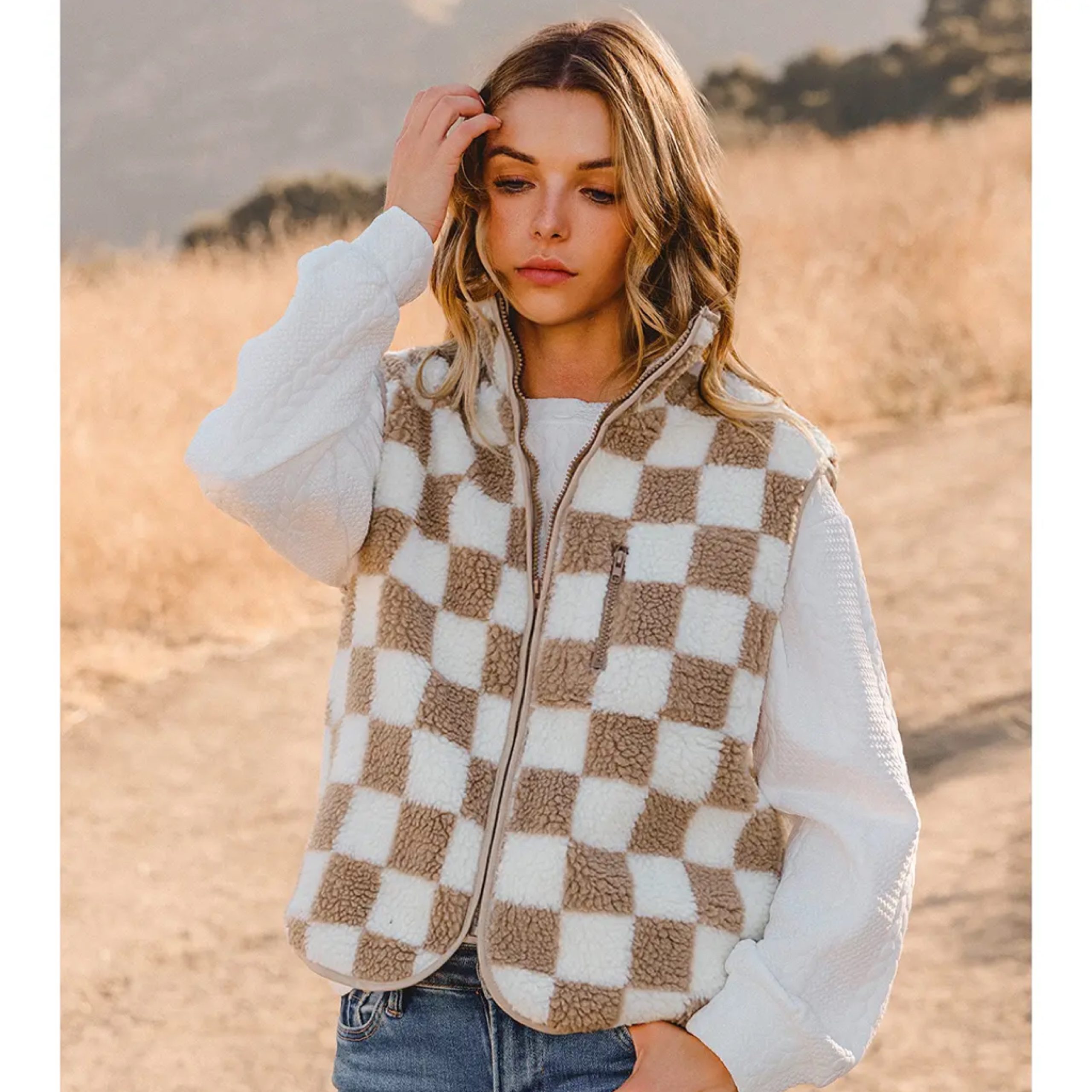 Checkered Sherpa Collared Jacket Vest