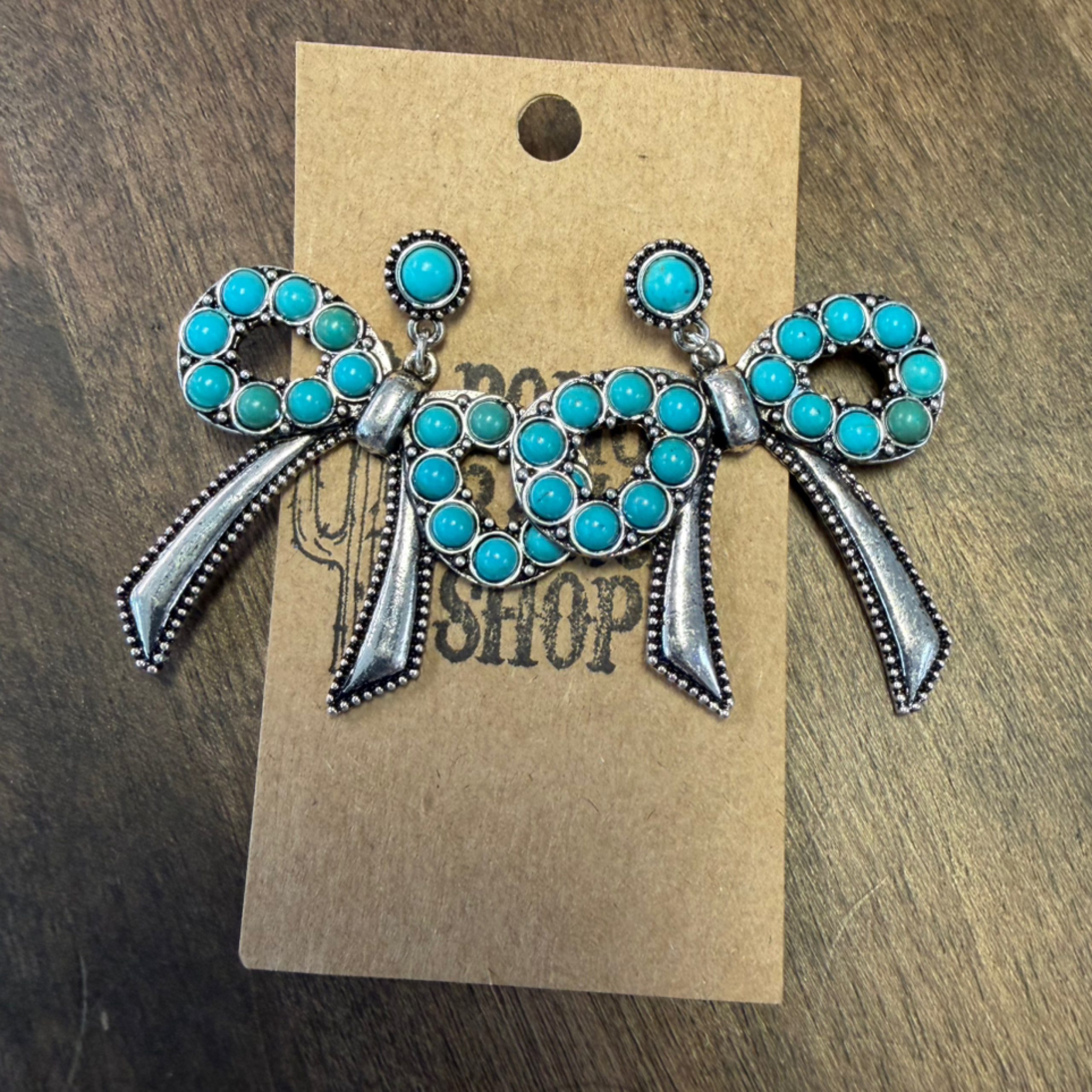 Coquette Bow Ribbon with Turquoise Stone Post Drop Earrings