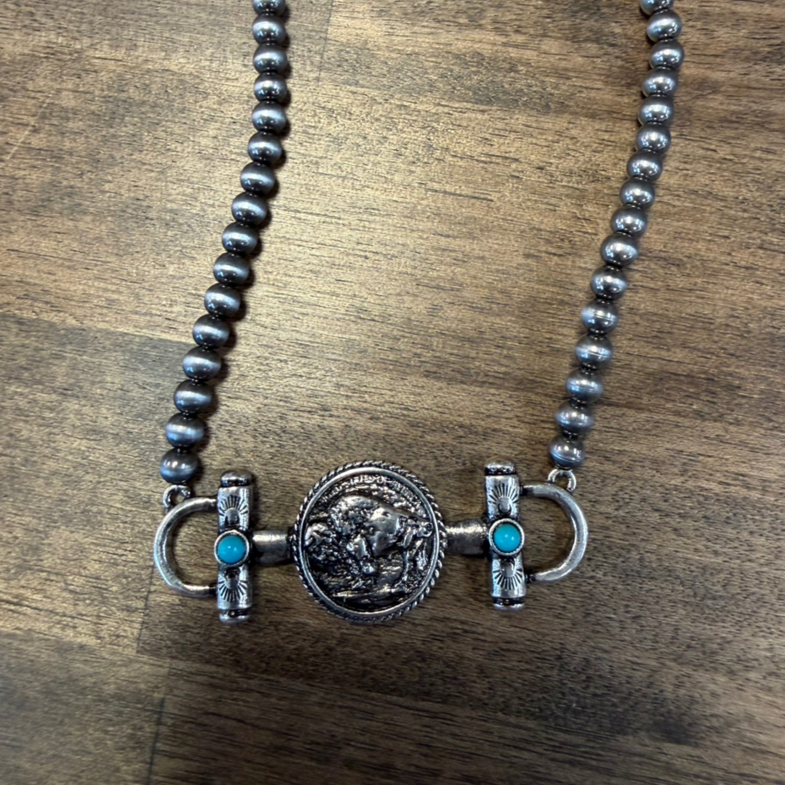 Western Style Buffalo w/ Horse bit Pendant Navajo Pearl Necklace Size: 18"L + 3"L Pendant: 2.75"W Lobster Claw Clasps Brushed Silver, Turquoise Stone Lead Compliant